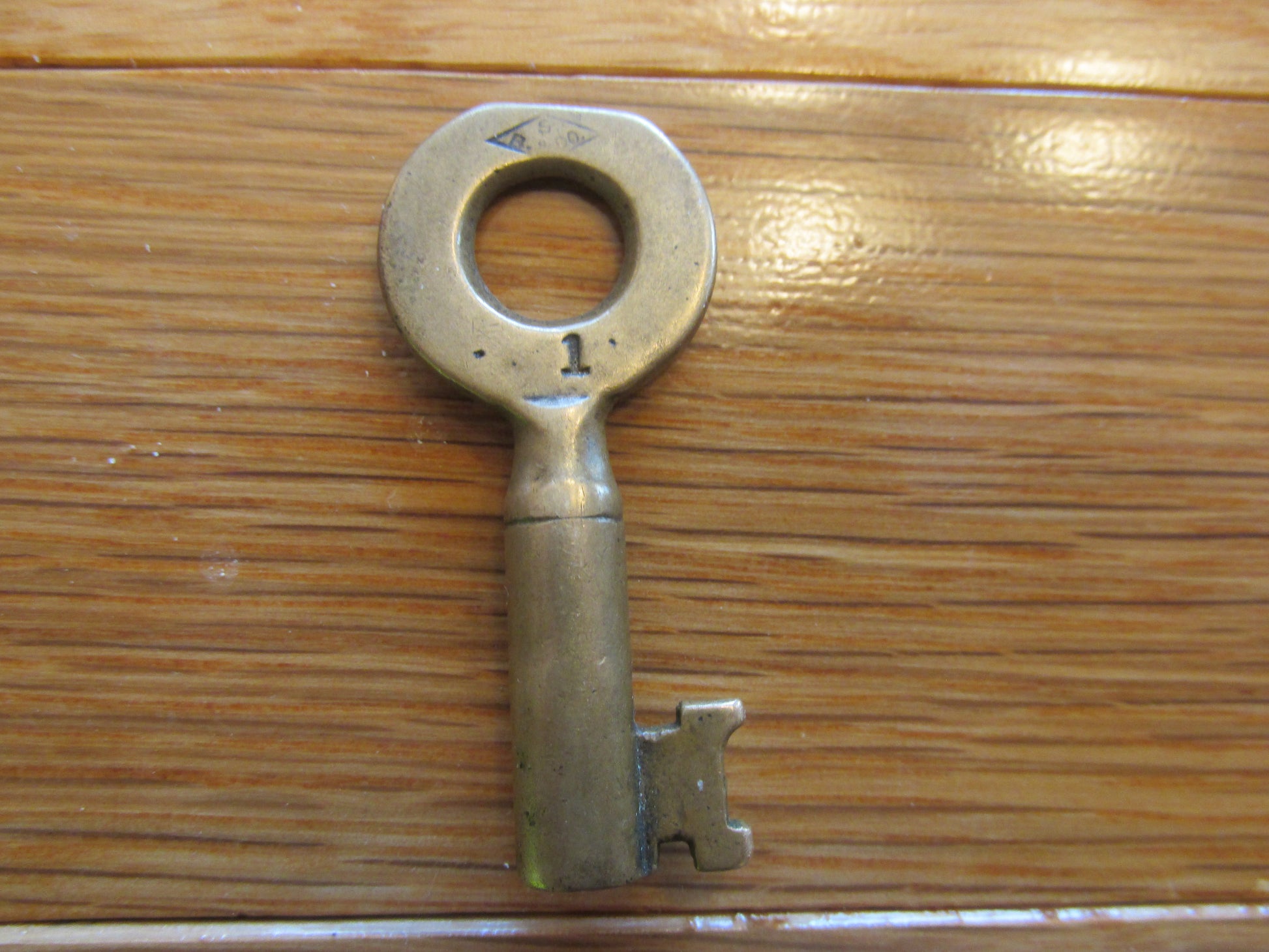 Nice early tapered barrel key Marked for the Santa Fe railroad. Front has AT-SF RR stamped on it. Back side has the old Slaymaker-Berry diamond logo, and the number one. Lock & key were not for switch but a special purpose lock. Mostly the number series was stamped 1-5. Many collectors try to get the complete series 1-5. Key has seen much use with the bit showing wear. Still a hard and desirable key to obtain for the Santa Fe key collectors.
