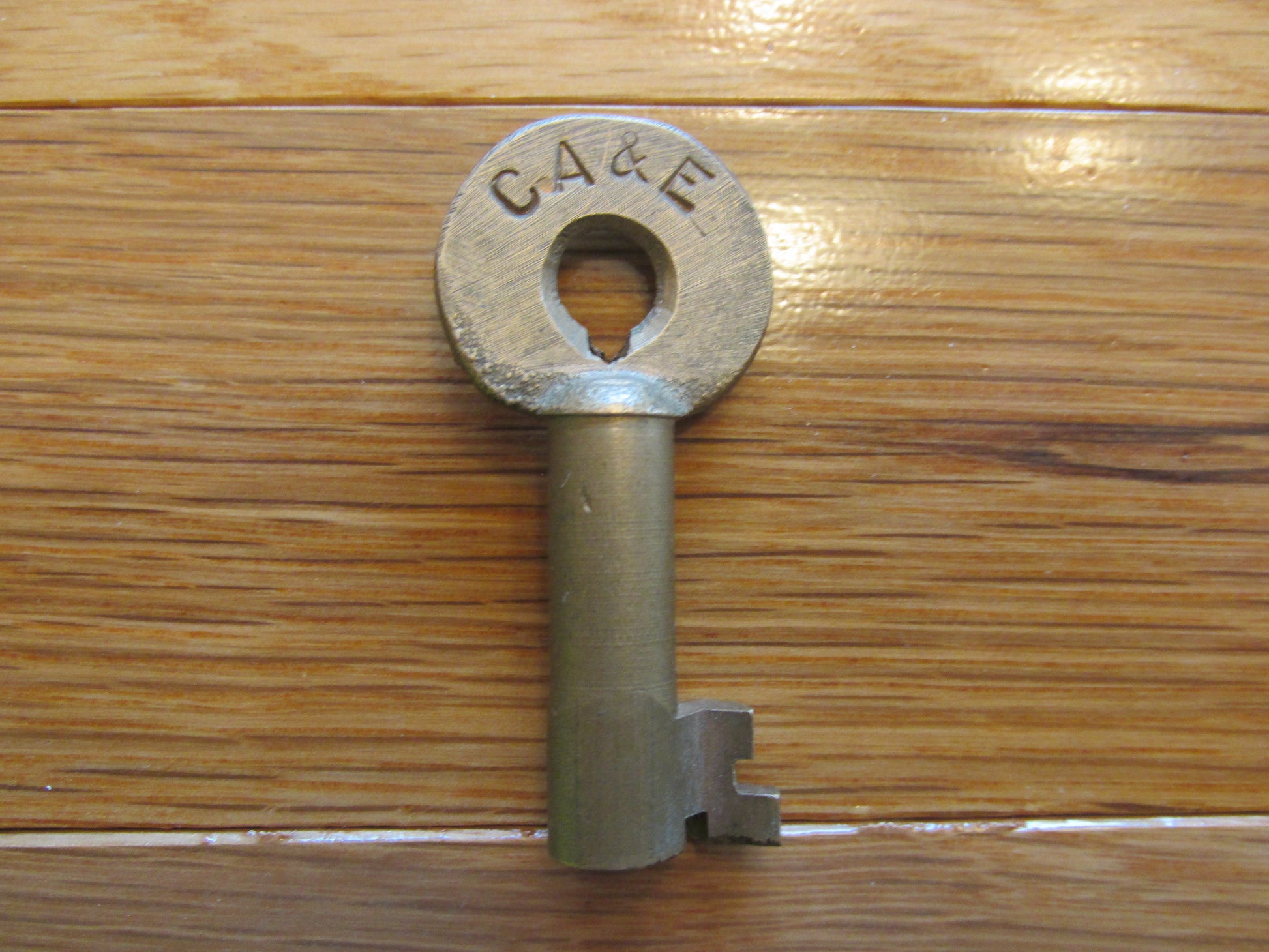 Here is your chance to own a top shelf key from the Chicago land area. Front is stamped CA&E for the Chicago Aurora & Elgin railroad. Back side has the small Adlake. The CA&E was known as the 3rd great rail. It was an Interurban railroad opened in 1902 having 33 miles of track. Deeply stamped CA&E on the front having near perfect pocket wear. One of the best looking keys I have seen from this road. Interurban collectors here is your chance to own a super key.