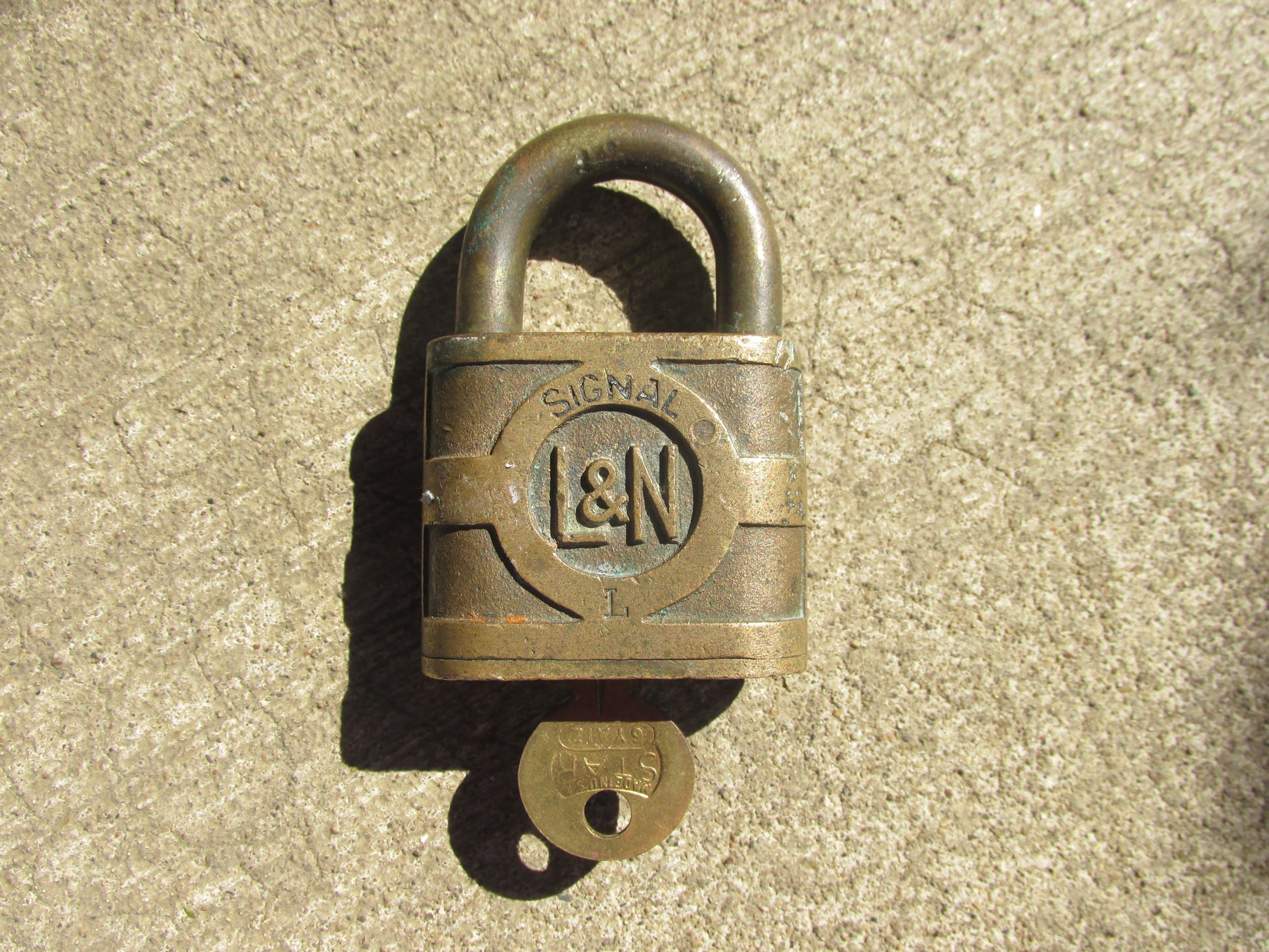 Somewhat harder Yale cast signal lock & key to find marked L&N for the Louisville & Nashville railroad. Set is in good working order with the shackle popping up slightly when the key is turned. In my opinion the shackle would pop up more when lubricated. I will let the new owner decide on that. The only real issue the lock shows is a dent on the back side. Price was lowered accordingly. Any questions please email me